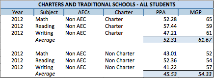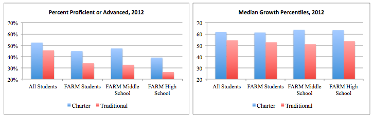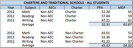 So how do charter and traditional schools compare? In 2012, charter schools in Denver performed better than traditional schools in both the percentage of students who were proficient or advanced (PPA), and in academic growth (median growth percentiles, or MGP). This difference was substantial: 6.8 percentage points in PPA and just over 7.3 points in MGP.