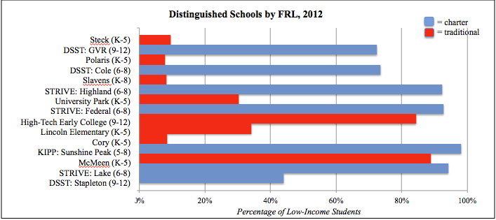 And how are these respective schools doing serving the low-income kids about whom Mr. Jimenez is most concerned? Well, of the seven distinguished charter schools, all but one serves a percentage of low-income kids equal or higher than the district average. Of the eight distinguished traditional schools, just two can make the same claim.