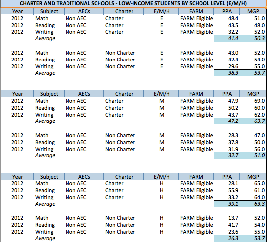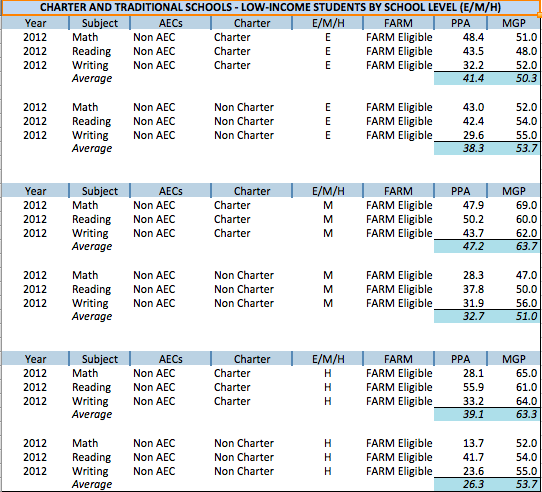 What is even more revealing about these numbers is that there are very few charter schools serving elementary school kids — which is where traditional schools tend to see their best results. Want to look at how low-income kids are doing in secondary grades?