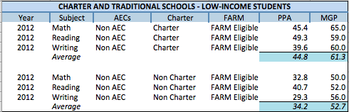 Half of the traditional schools in this august group have less than 10% low-income kids. In contrast, the charter with the lowest percentage of low-income students is still higher than all but two of the traditional schools.