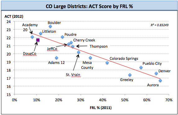 The important concept here is how far each district is from the regression line; those below it are underperforming relative to other districts; those above are doing better than most. And where is DougCo on this graph? Well, they had the second-lowest percentage of low-income 10th graders in 2011 (11%), which means that although their average 2012 ACT is the fifth highest in the sample group, it is below the regression line. DougCo is slightly under where they should be for ACT scores, given the affluence of the district.