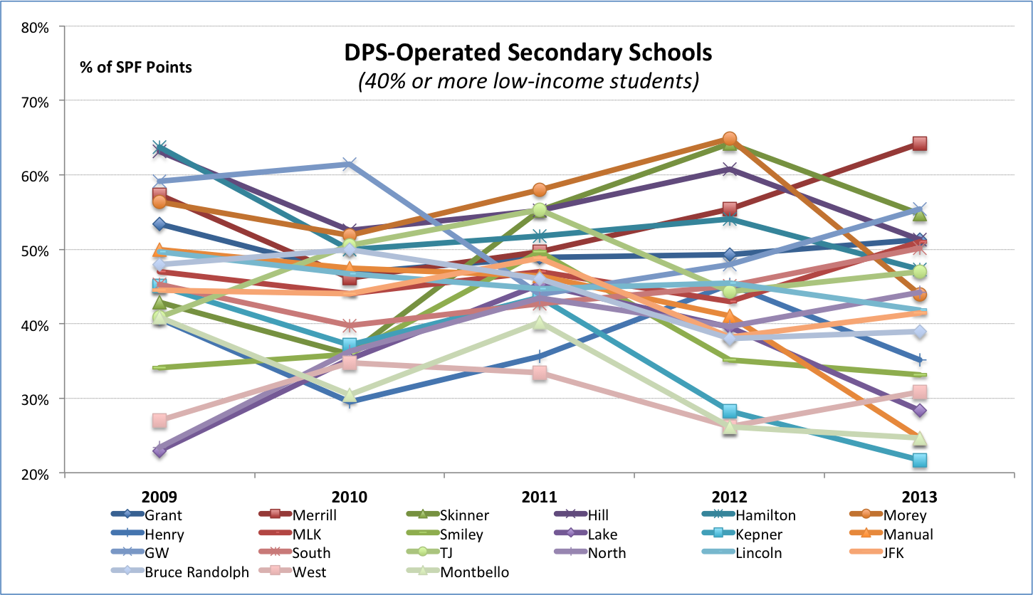 Particularly depressing are the schools that have undergone significant transformations, often at great expense and with considerable turmoil. Anyone who follows the news will know the names: Manual High School, profiled in the New Yorker (50% of SPF points in 2009, 25% in 2013), Bruce Randolph, mentioned by President Obama in a State of the Union address (48%, 39%), Lake (23%, 28%), Lincoln (50%, 42%) and more. It is a big enough sample where there are bound to be individual schools with praiseworthy improvements — such as North High, which has moved from an SPF score of 23% to 44% — but these are balanced by other declines, and there is a hard and low ceiling of overall achievement. In a large district, DPS can always point to anecdote, but the aggregate numbers tell a story of traditional secondary schools completely immune to the district’s medicine. Indeed, there is no historical basis to believe that DPS can operate high-quality secondary schools that serve a significant proportion of low-income students.